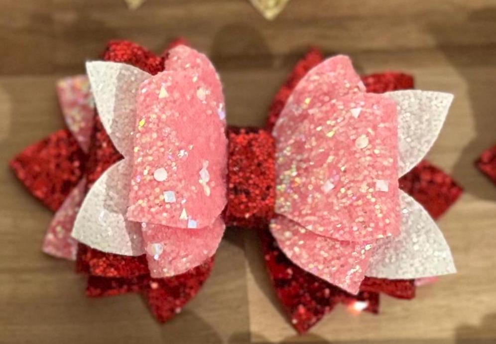 Glitter tumbler bow. Fits Stanley Tumblers. 4.5" across the back. This bow has a back that slips over the straw. It can be changed to elastic or Velcro by adding that listing for a special request to your cart for 50 cents.