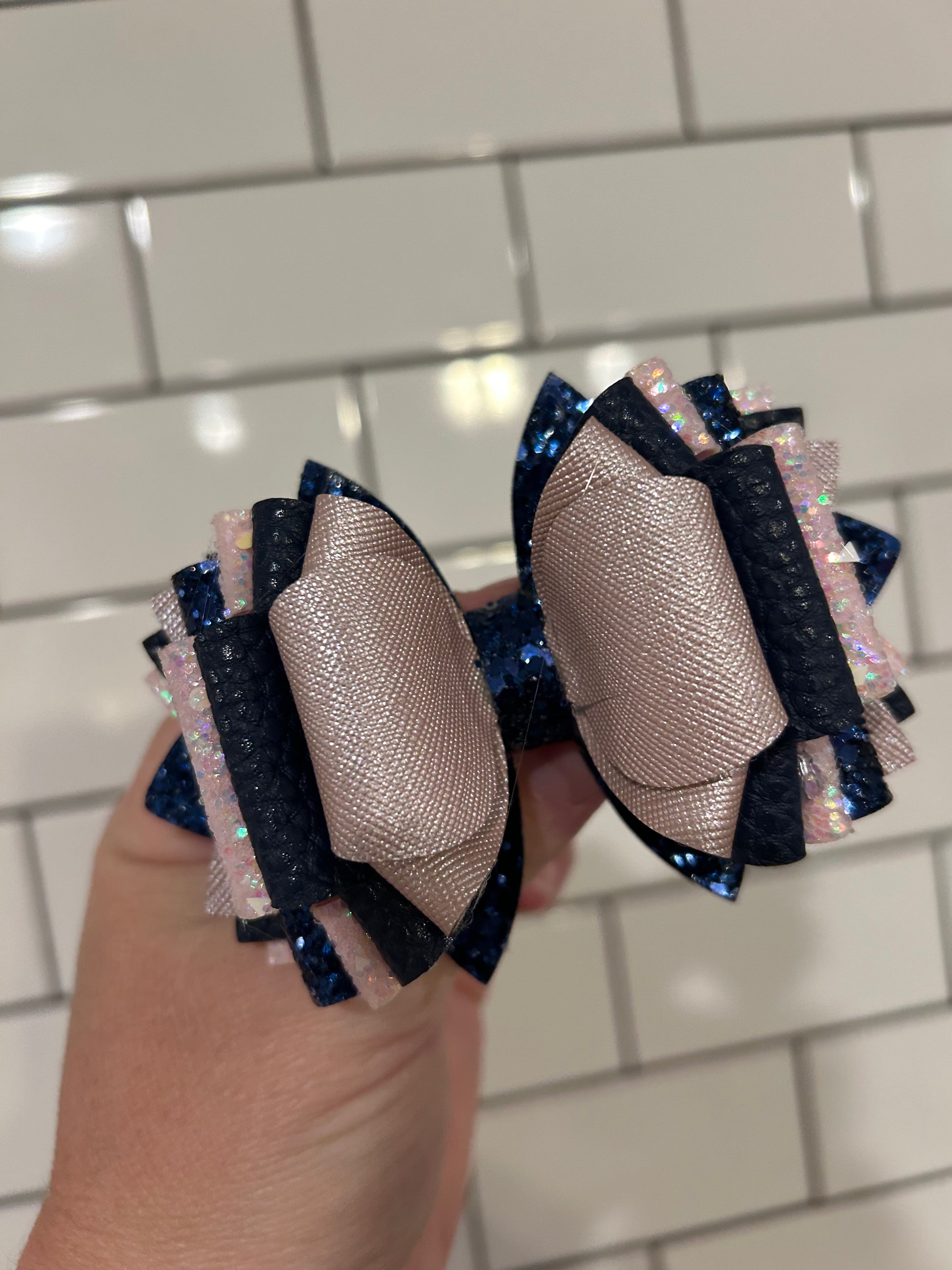 Glitter tumbler bow. Fits Stanley Tumblers. 4.5" across the back. This bow has a back that slips over the straw. It can be changed to elastic or Velcro by adding that listing for a special request to your cart for 50 cents.